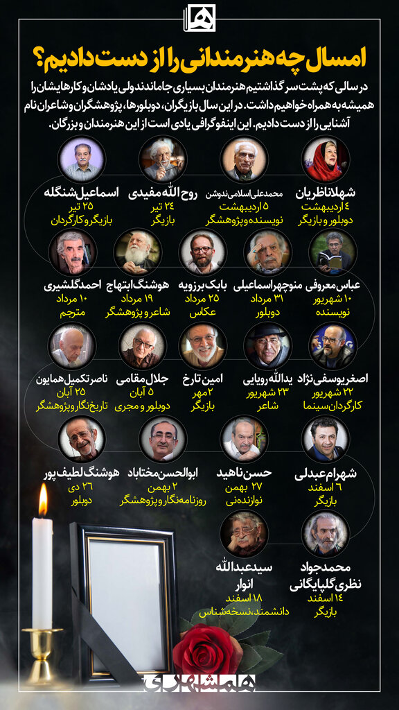 سه پژوهشگر را هم در این سال از دست دادیم. ناصر تکمیل همایون، جامعهشناس و پژوهشگر و تاریخ نگار و تهران شناس، محمدعلی اسلامیندوشن، پژوهشگر و نویسنده و شاعر و همین اواخر استاد عبدالله انوار، پژوهشگر و تهران شناس. این اینفوگرافی یادی است از این هنرمندان و بزرگان.